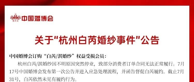 中国婚博会就“杭州白芮婚纱事件”再次发布公告。针对未过婚期、再次新定婚纱...